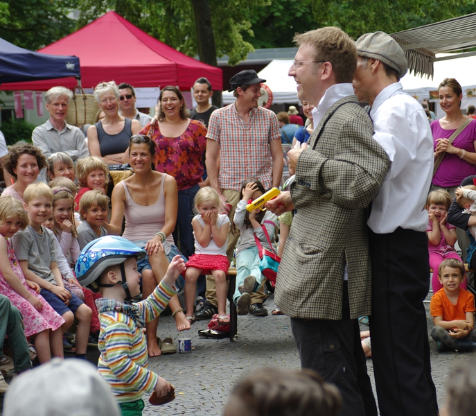 Das Publikum ist natürlich vom Auflauf bis zum Ende mit einbezogen. Interaktion spielt eine Schüsselrolle, auch Freiwillige sind willkommen (natürlich ohne Zwang). Kurze Nummern werden collagenhaft